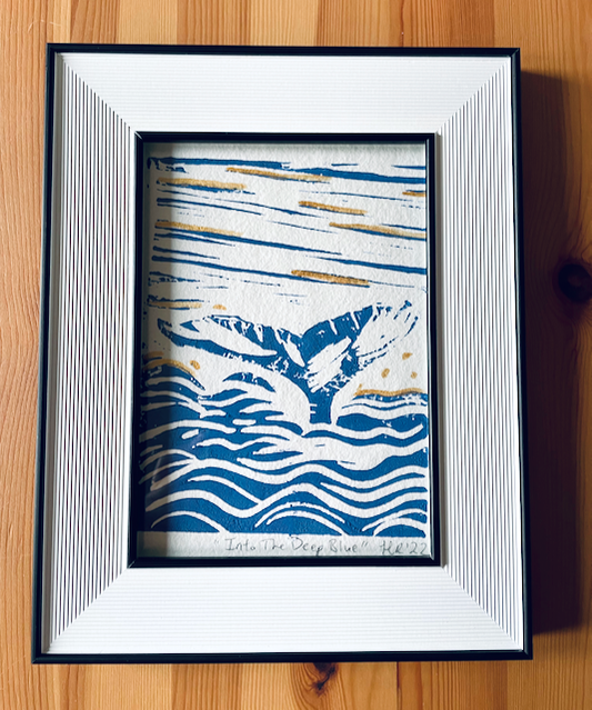 Framed Whale Linoprint-"Into The Deep Blue"-Mini Print