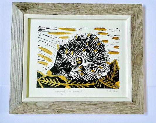 Hedgehog Linocut Print-"Amongst the Leaves"-Framed Print