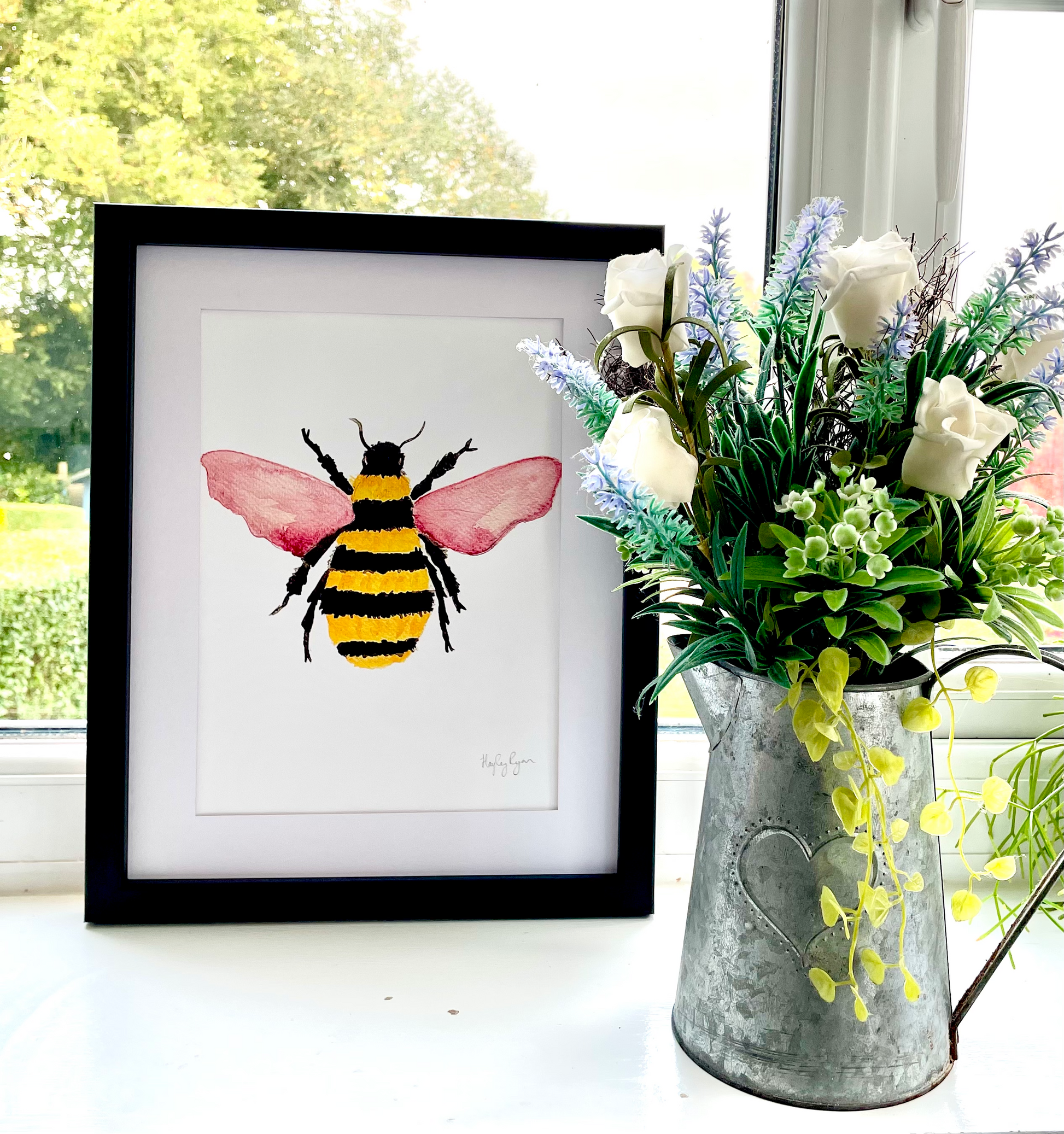 A colourful and unique bee print with pink wings which is taken from an original watercolour painting created by myself .