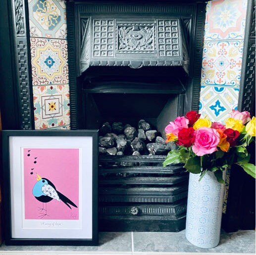 A colourful and pretty bird singing print on a lightly patterned background which will brighten up walls in any room of the house and also makes an ideal gift to any bird or nature lover.