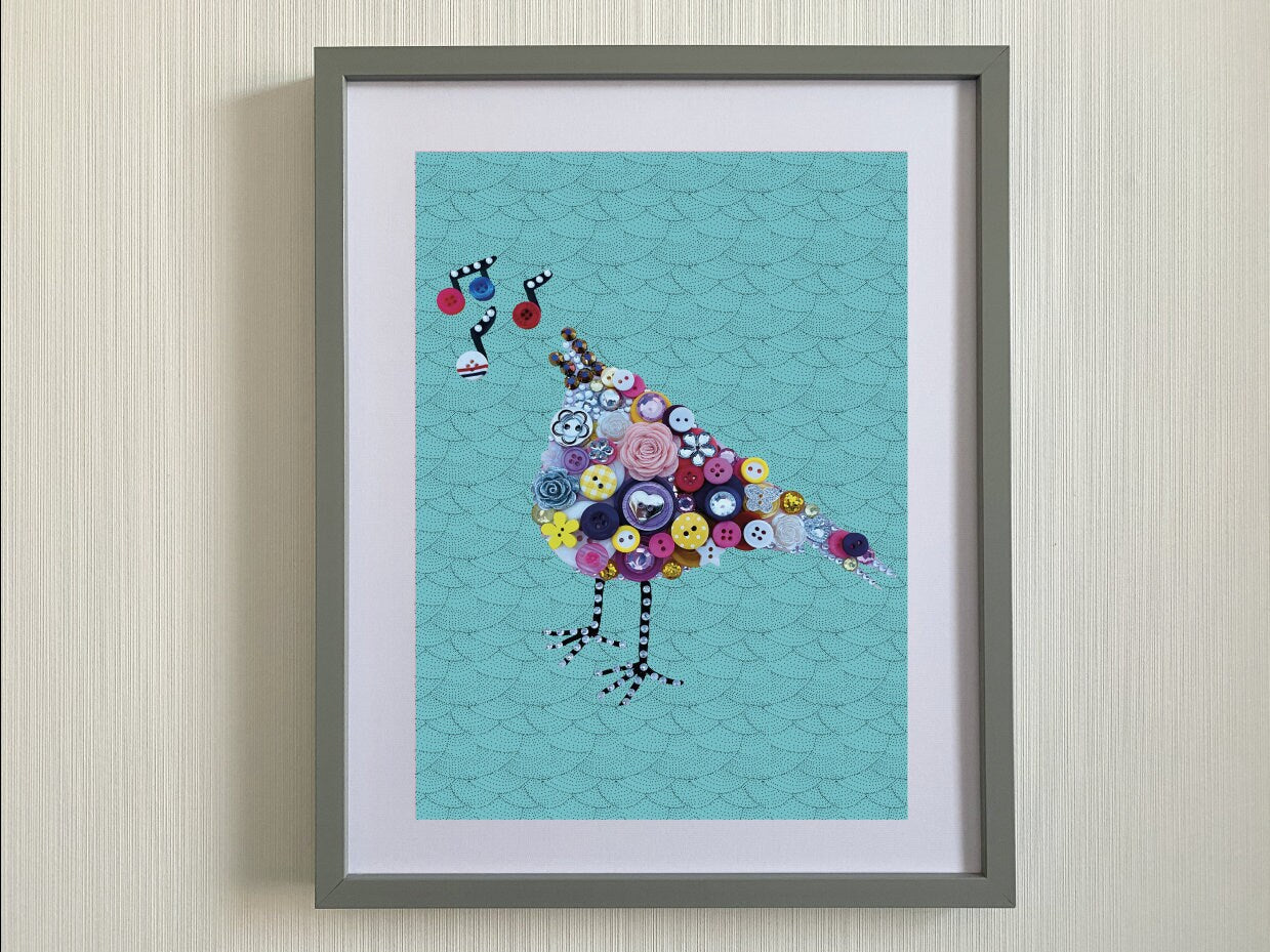 This beautiful print is taken from an original handmade picture of a singing little bird created from buttons and beads which I created and then turned into a print.