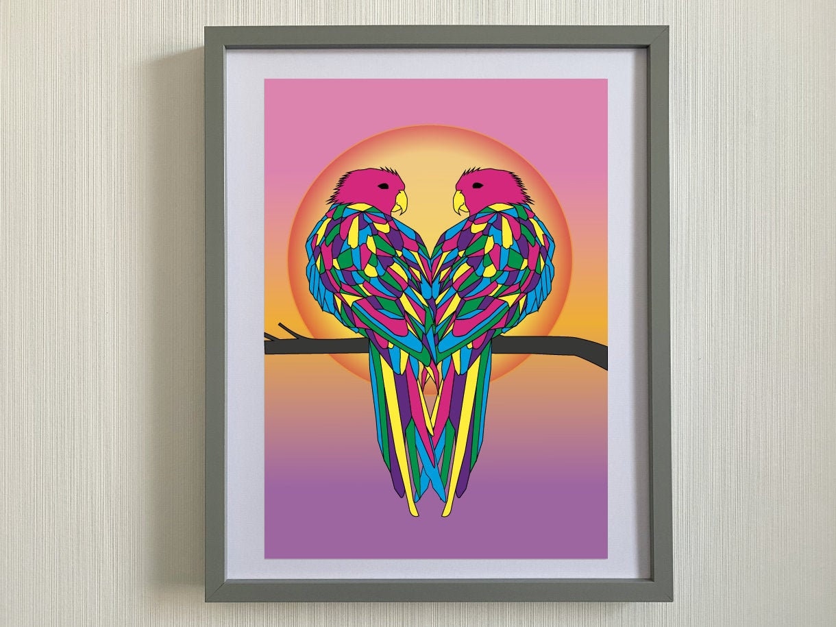 Wild Birds - This colourful picture depicts a pair of beautiful wild birds against the setting sun ,their bodies close together making a heart shape.