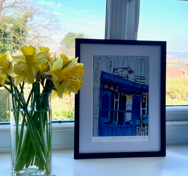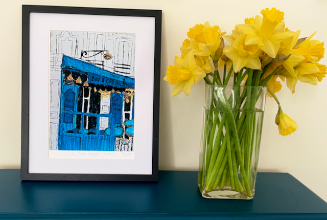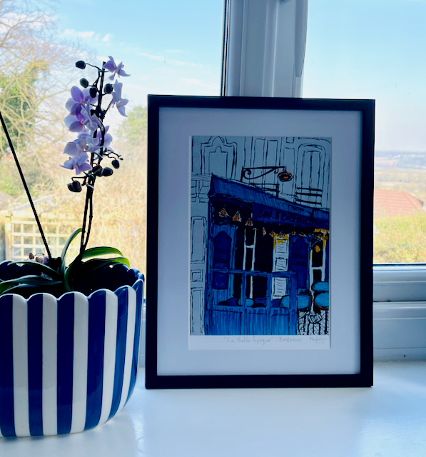 A unique illustration of "La Belle Epoque" a quaint cosy little cocktail bar nestled along the vibrant streets of Bordeaux taken from my original coloured pen drawing from my sketchbook on my trip to Bordeaux..