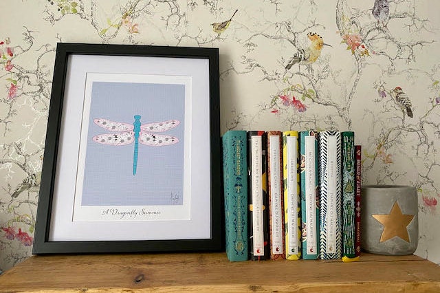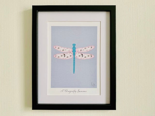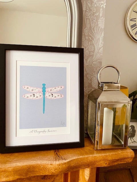 A pretty dragonfly with floral wings on a lightly patterned grey background which will brighten up walls in any room of the house and also makes an ideal gift for any dragonfly or nature lover.