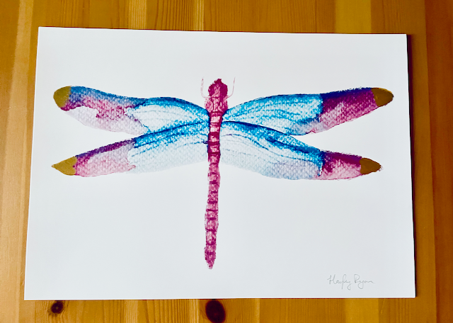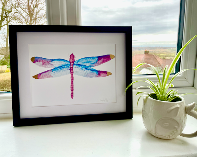 A colourful and unique dragonfly print which is taken from an original watercolour painting created by myself .