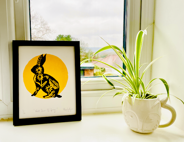 I have carefully created this original hand printed Linocut print of a beautiful Hare in front of a bright sun using high quality inks on premium acid free paper to ensure a long lasting and beautiful print.