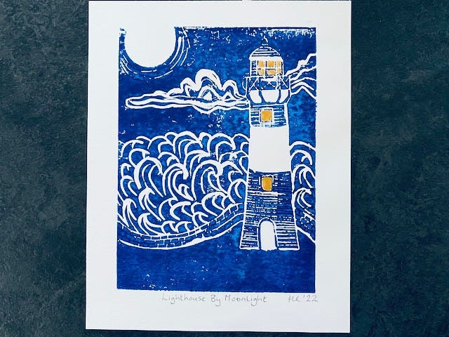 Lighthouse Linoprint -"Lighthouse By Moonlight"