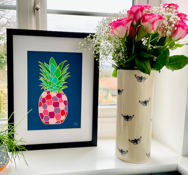 A colourful and unusual pineapple against a dark blue lightly patterned background which will brighten up walls in any room of the house and also makes an ideal gift .