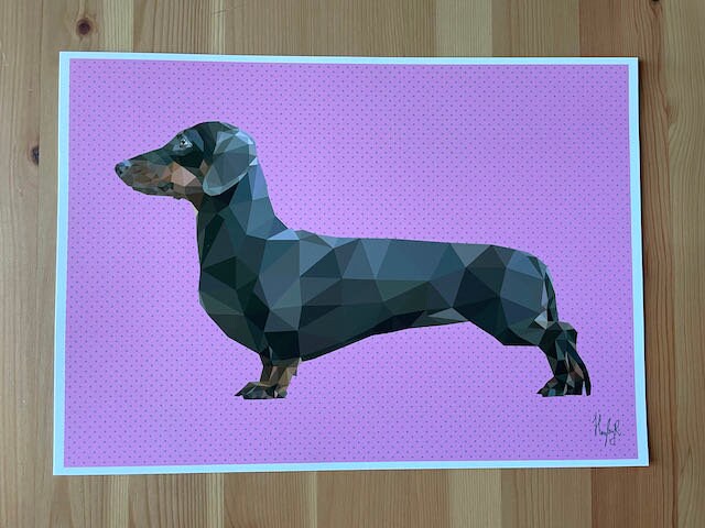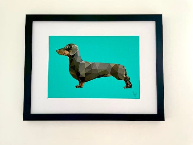 A colourful and cute sausage dog in a low poly art style which will brighten up walls in any room of the house and also makes an ideal gift for any sausage dog and animal lover in general.