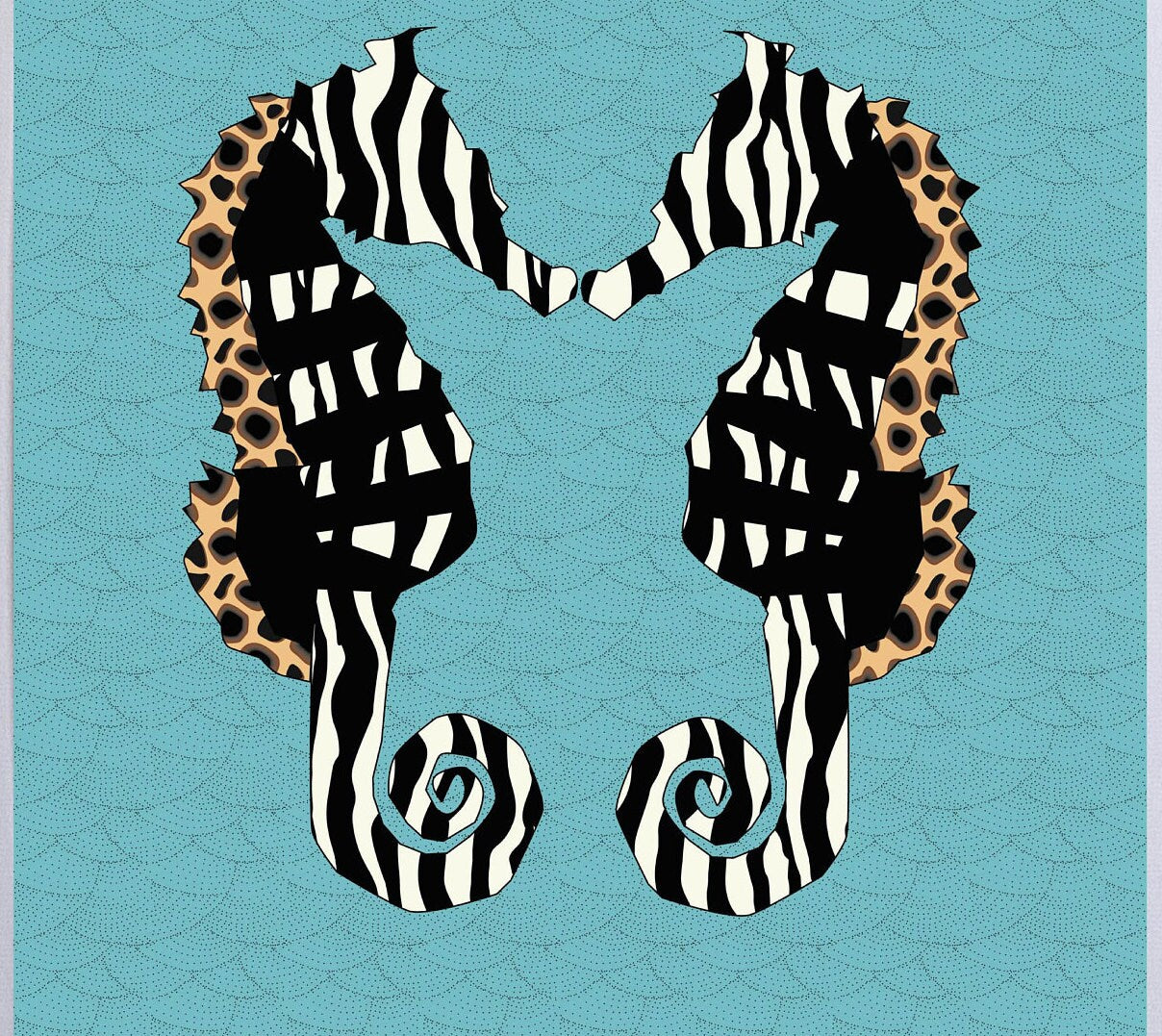 A striking picture of a pair of beautiful seahorses using zebra and leopard print details blending the beauty of land animals with the beauty of these gentle animals of the sea..