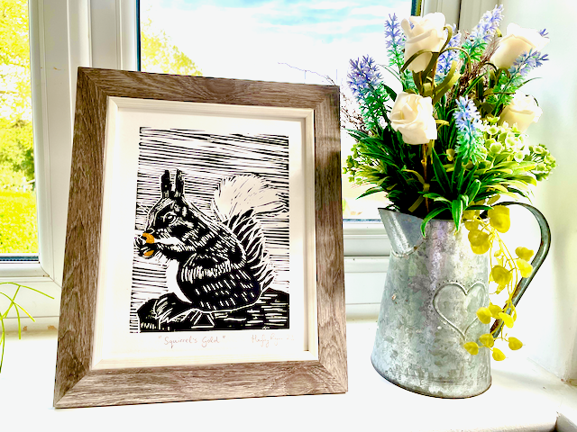I have carefully created this original hand printed Linocut print of a beautiful squirrel holding a golden nut using high quality inks on premium acid free paper to ensure a long lasting and beautiful print.