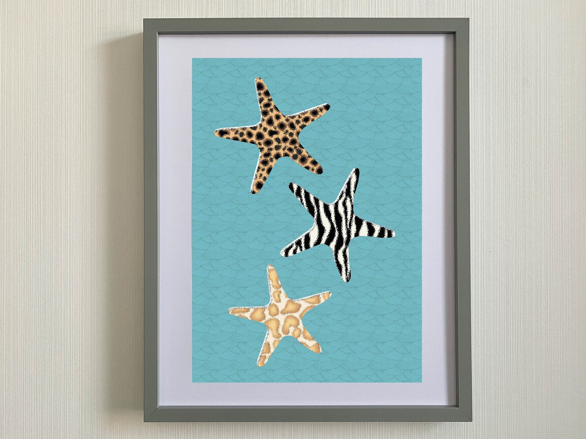 Starfish Print-A trio of animal print starfish -This bright and unusual picture will add some colour and a feel of the ocean to your bathroom wall.